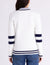 • Striped v-neckline, cuffs, and hem for varsity-inspired detail