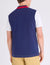 A: The shirt features a sophisticated navy colorblock on the main back panel with white sleeves, providing a streamlined and athletic look from every angle.