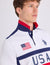 Intricate Americana Appliques: Features a large "USA" chest graphic, a high-definition U.S. flag patch, and the iconic navy double horseman embroidery.