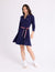 Fit-and-flare silhouette with a swing skirt and belted waist; flattering on all body types.